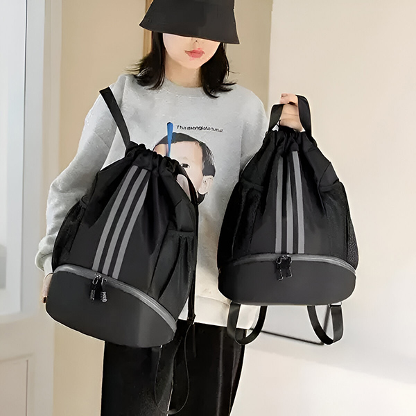 Compartimentul mare cu șnur este perfect pentru depozitarea hainelor de sport, pantofilor, prosoapelor și a unei sticle de apă. Are un loc specific pentru tot ceea ce aveți nevoie pentru o sesiune de antrenament eficientă. Nu mai trebuie să căutați prin geantă—totul are locul său.